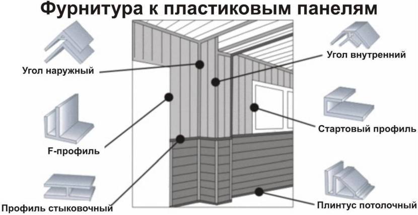 Помимо основной облицовки потребуются декоративные отделочные профили для углов, стыков панелей с потолком и полом, окантовки люков. Это специальная фурнитура, которую производят специально для облегчения монтажа и оформления пластиковой отделки. Часть можно заменить обычными плинтусами, потолочными карнизами, молдингами из других материалов. Но без стартового профиля обойтись вряд ли получится. Он служит для фиксации крайних панелей, окантовки вырезов и дверок.