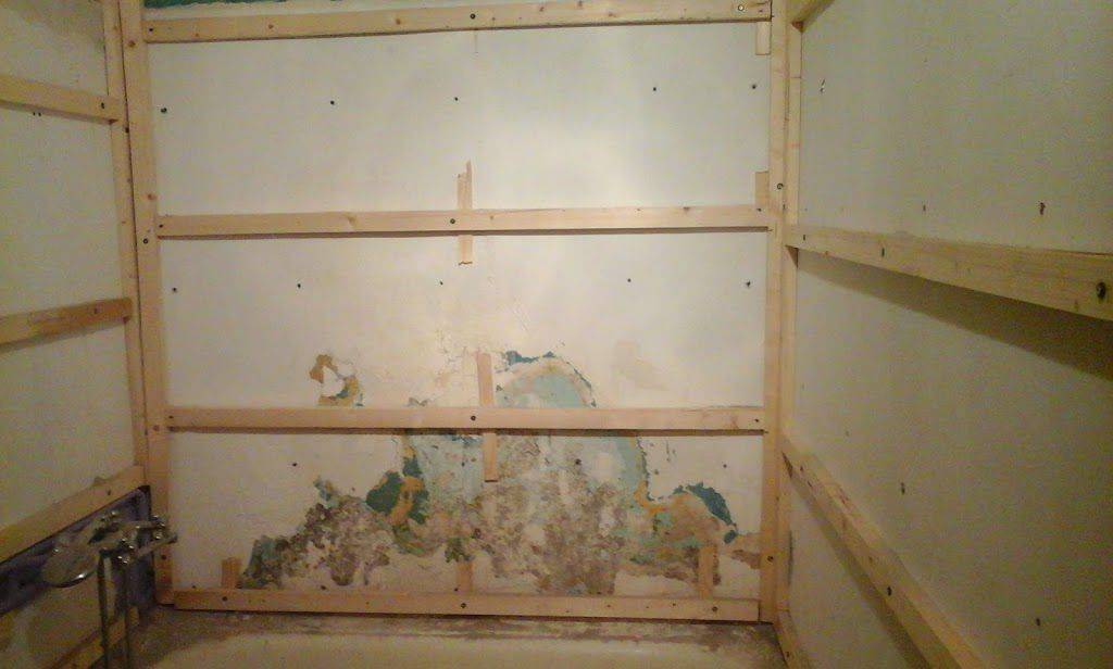 Замена старых кранов на шаровые, плюс фильтры грубой очистки и редукторы давления и сгоны. Учитывая наклон обеих стен в одну сторону до 4 см и кривизну, решил ставить стеновые панели. На обрешетке не заморачивались – в гараже было полно разных реек, досок и брусков не совсем новых, но вполне пригодных.