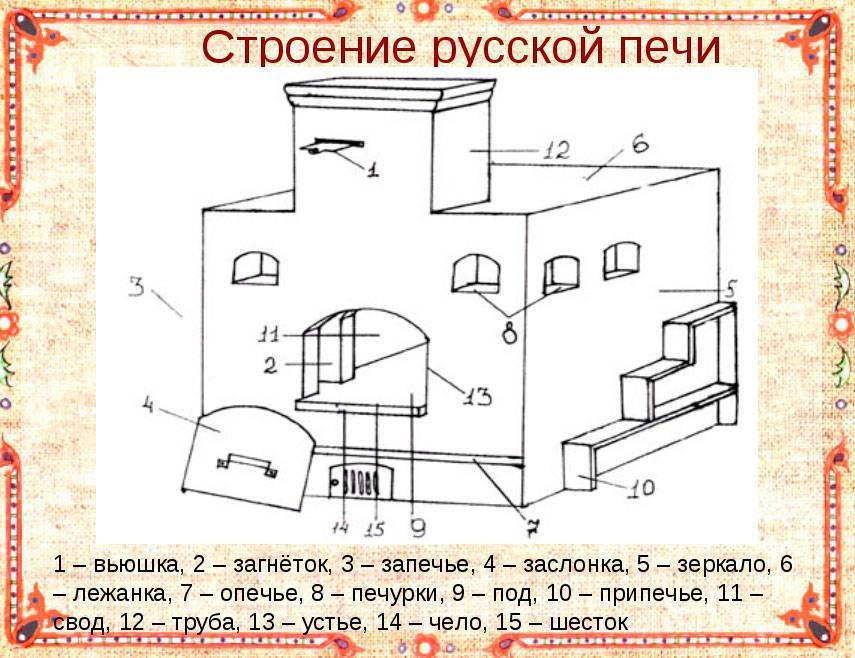 - Основные элементы, без которых устройство русской печи немыслимо: