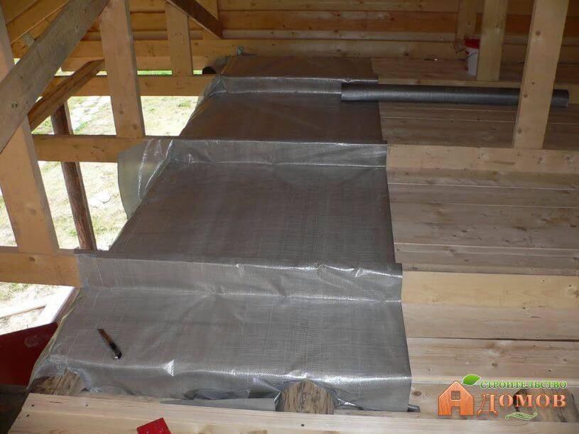 - Поверх теплоизоляционного материала внахлест выстилается фольгированная пароизоляция, чтобы уберечь утеплитель от конденсата.