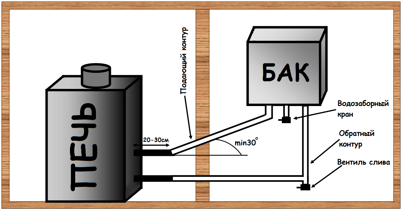 В случае если насос в системе не предусмотрен, то рекомендуется следующее устройство и взаимное расположение труб: холодная вода из бака самотеком идет по трубе к печи, а горячая возвращается к баку. Главное условие: трубы должны быть установлены под углом в 2-5 градусов.