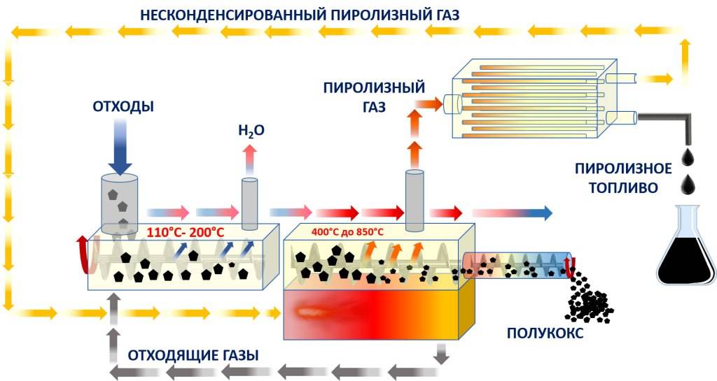 Пиролиз отходов заключается в том, что под воздействием высоких температур в условиях вакуума разлагаются тяжелые органические вещества, на выходе получают более легкие. В результате такого воздействия из отходов получают вещества с более низкой молекулярной массой.