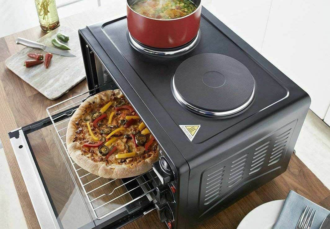 Конфорки — не обязательное условие для электрической печи. Далеко не во всех моделях они есть. Но если все же варочная поверхность имеется, то представлена она 2 конфорками — больше на мини-печи разместить нельзя.