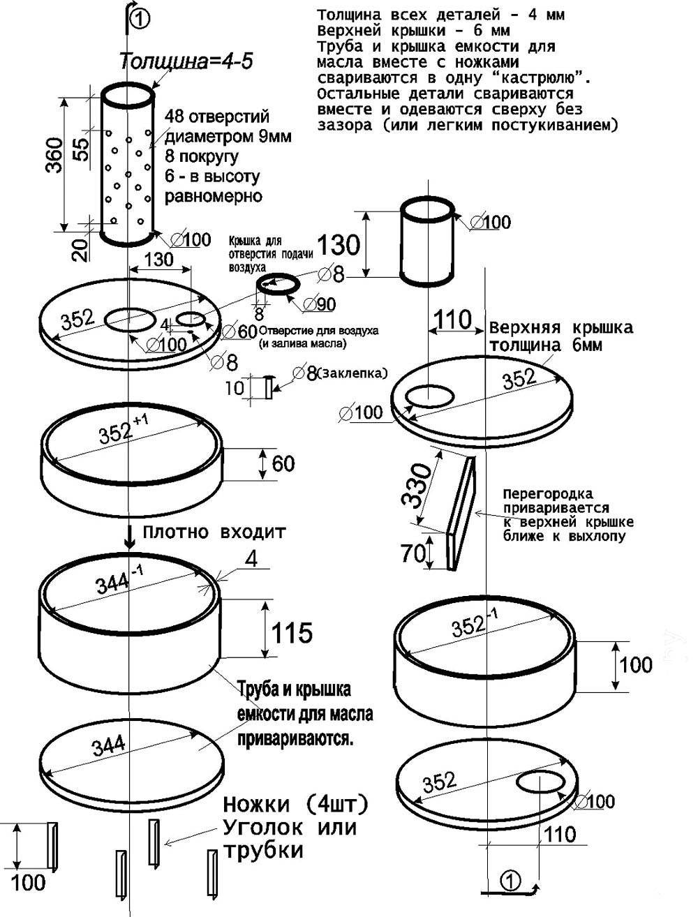 - толщина стали для резервуаров – 4 мм, для донышка топливника и крышки верхнего резервуара – 6 мм;