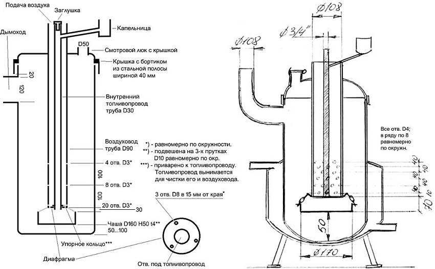 В конструктивном плане агрегат представляет собой две емкости, которые соединены между собой перфорированной трубой, имеющей множество отверстий. Если принято решение в пользу установки в гараже печи на отработке, то необходимо, чтобы она соответствовала таким требованиям: