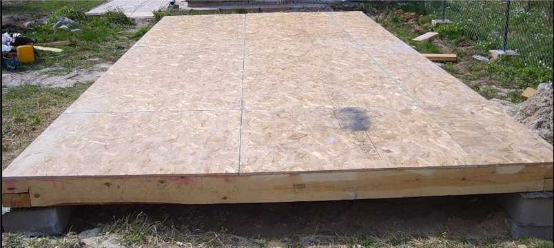 В данном случае была выбрана технология «платформа» и на лаги настелили ОСП 18 мм толщины. Вообще, пол можно сделать из досок, фанеры (влагостойкой), ОСП и т.д. Доска потребуется 20, фанера — 13-15 мм, но нужна влагостойкая (ОСБ влагостойкая по умолчанию).
