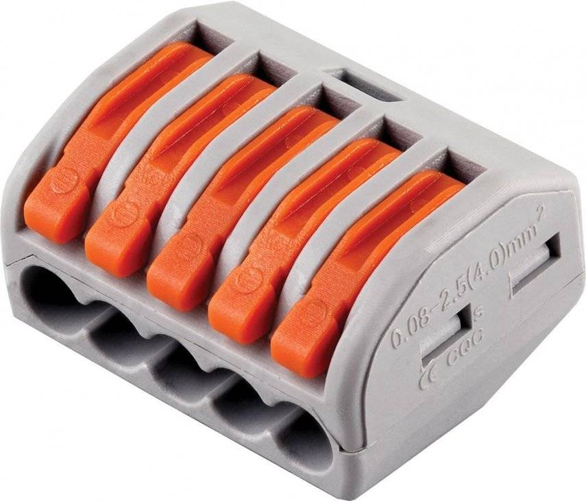 Строительно-монтажные клеммы. Используются для подключения проводников внутри коробки. В них установлено специальное пружинное соединение, поэтому контакт обеспечивается надежный. Очень удобно то, что такие клеммы позволяют использовать одновременно одножильные и многожильные проводники, медные и алюминиевые.