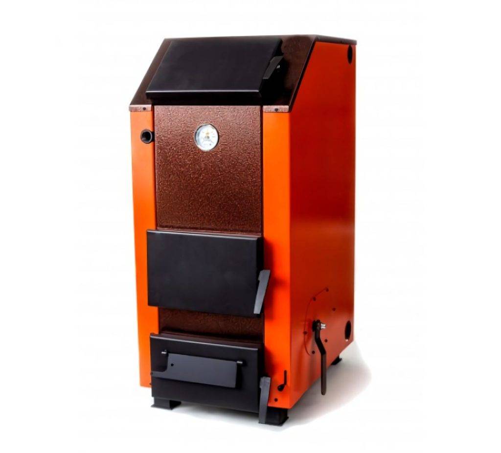 Простая и надежная конструкция, рассчитанная на отопление небольшого дома или дачи, площадью до 100 кв.м. Работает на дровах и угле, предусмотрена установка ТЭНа, мощностью 6 кВт. Рекомендуемое давление в системе – до 3 атмосфер. Конструкция теплообменника упрощает доступ при чистке. КПД достигает 80%, приближаясь к показателям котлов на дизельном топливе.