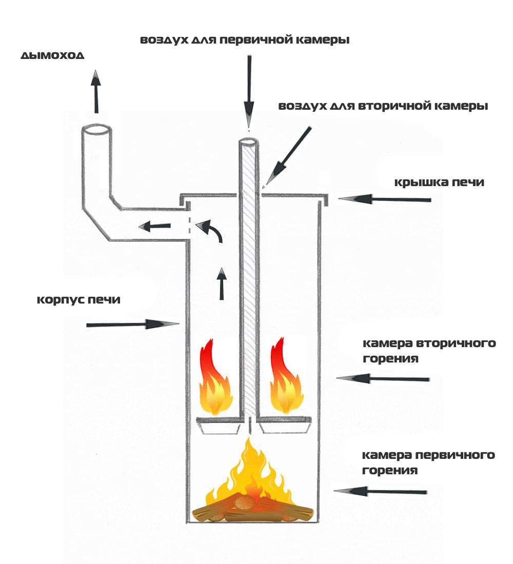 - Камера дожига – сжигается газ, выделяемый топливом.