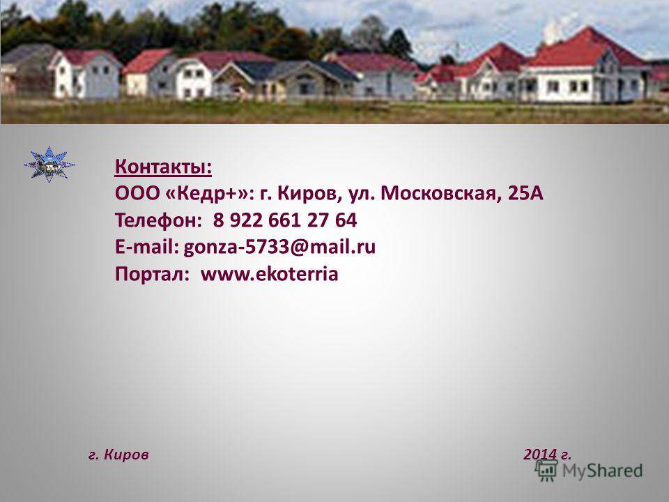 Контакты: ООО «Кедр+»: г. Киров, ул. Московская, 25А Телефон: Портал: г. Киров 2014 г.