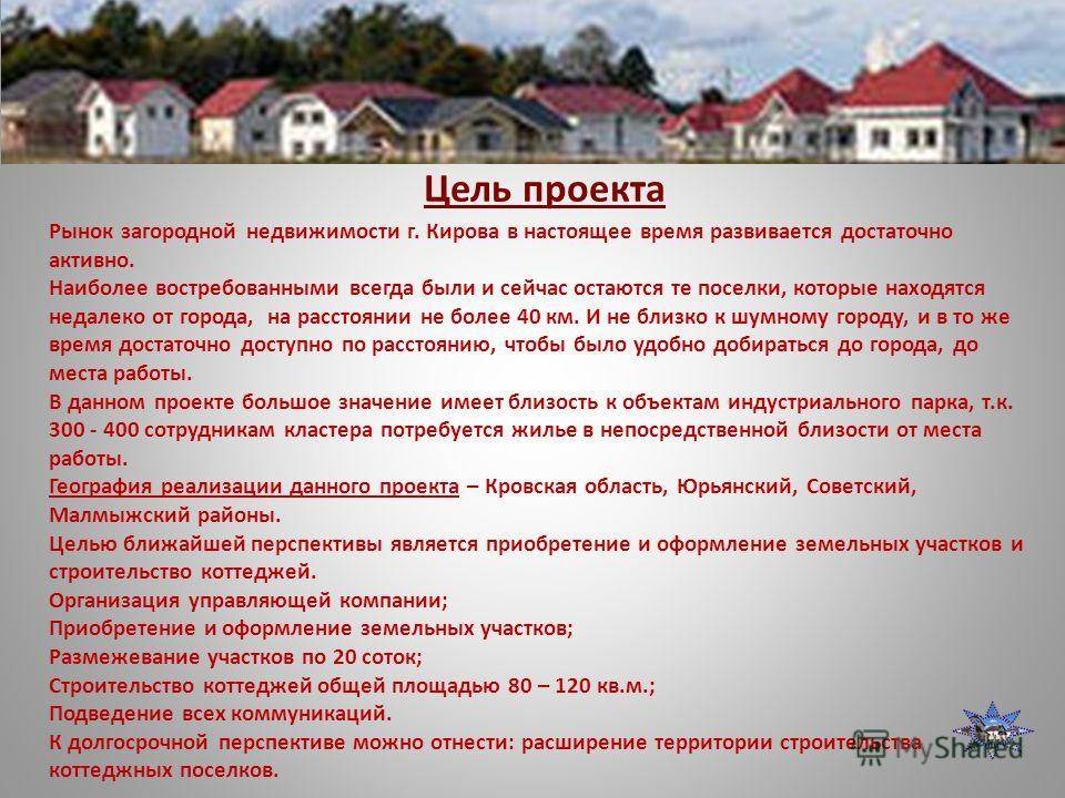 Рынок загородной недвижимости г. Кирова в настоящее время развивается достаточно активно. Наиболее востребованными всегда были и сейчас остаются те поселки, которые находятся недалеко от города, на расстоянии не более 40 км. И не близко к шумному городу, и в то же время достаточно доступно по расстоянию, чтобы было удобно добираться до города, до места работы. В данном проекте большое значение имеет близость к объектам индустриального парка, т.к сотрудникам кластера потребуется жилье в непосредственной близости от места работы. География реализации данного проекта – Кровская область, Юрьянский, Советский, Малмыжский районы. Целью ближайшей перспективы является приобретение и оформление земельных участков и строительство коттеджей. Организация управляющей компании; Приобретение и оформление земельных участков; Размежевание участков по 20 соток; Строительство коттеджей общей площадью 80 – 120 кв.м.; Подведение всех коммуникаций. К долгосрочной перспективе можно отнести: расширение территории строительства коттеджных поселков. Цель проекта