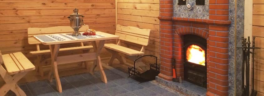 Самое главное, что внутренняя обстановка должна отвечать требованиям пожарной безопасности, а все детали должны быть устойчивы к повышенной влажности и высокой температуре. Но все натуральные материалы имеют высокую цену, поэтому для экономии можно использовать материалы, внешне имитирующие брус.