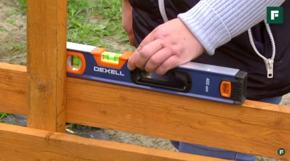 Когда поставлены три доски, время проверить насколько ровно они стоят уровнем. Если есть необходимость, будущий забор подравнивают киянкой. Установив примерно восьмую доску, необходимо опять выровнять конструкцию. Уровнем на этом этапе также нужно проверить насколько ровно стоит вертикальный деревянный столб.