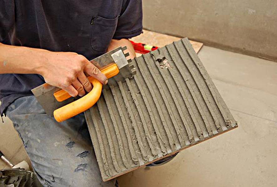 Сначала клей наносится на участок пола, необходимый для укладки 4–6 плиток. Для его нанесения используется шпатель средней ширины либо мастерок. Затем нанесенный слой распределяется шпателем с зубьями.