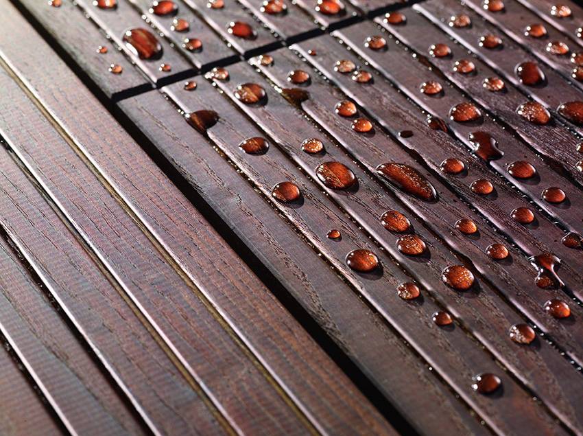 Влагостойкость. Поскольку ДПК содержит в своем составе полимеры, такой декинг не впитывает воду. Следовательно, не требуется укрывать его на осенне-зимний период. Нет необходимости пропитывать ДПК специальными гидрофобными составами, в отличие от натуральной доски. Не реагирует террасная доска ДПК на соль, содержащуюся в морской воде, или хлорку, поэтому такое покрытие идеально подойдет для оформления пирсов и площадки у бассейна.
