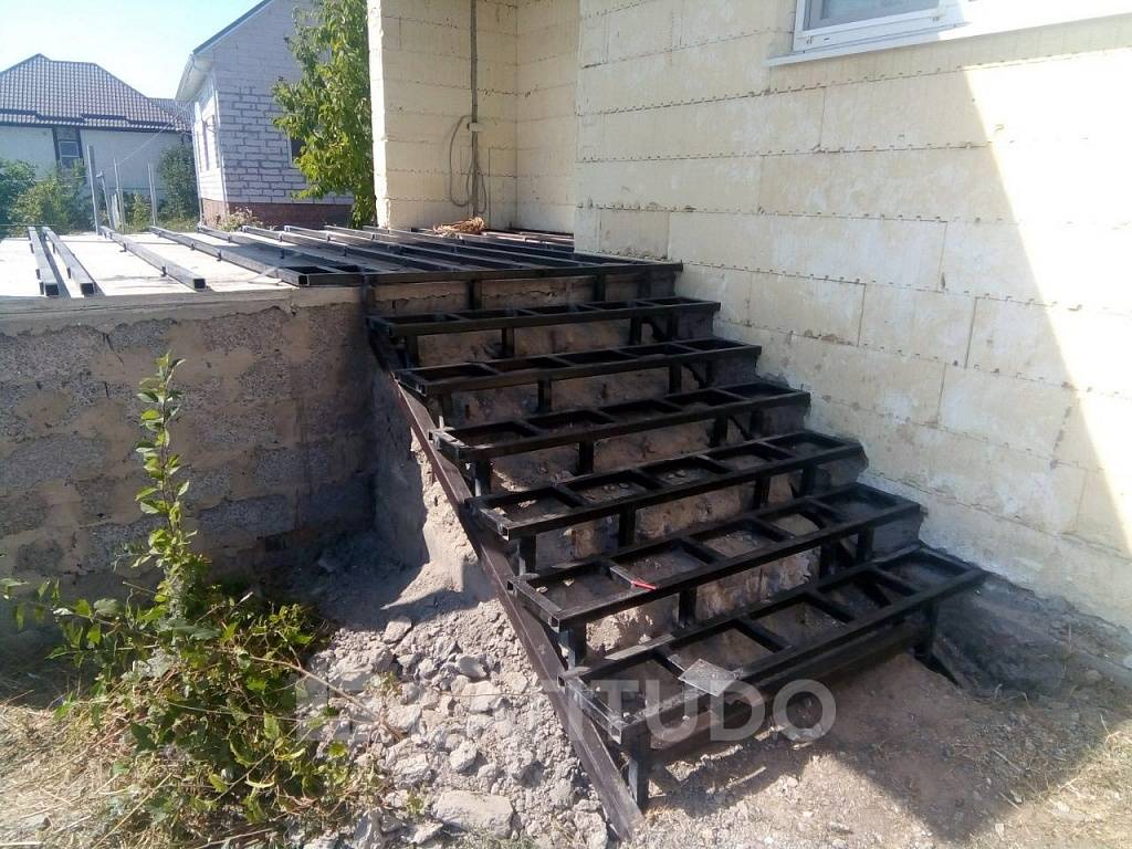 Каркас может быть установлен на голую землю с бетонированием столбов основания, или на имеющуюся поверхность. Если требуется восстановить разрушенное крыльцо, каркас наваривается поверх того, что от него осталось.