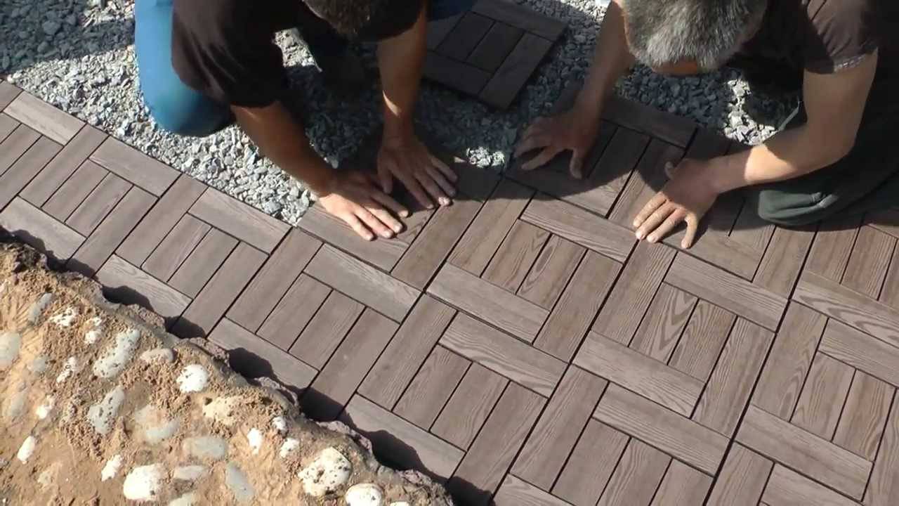 - Далее можно переходит к монтажу материала. Предварительно можно выложить модули на землю, для формирования какого-либо направление плиток. После выбора подходящей ориентации, плитки скрепляются между собой. Для этого по торцам плитки присутствуют замковые соединения.