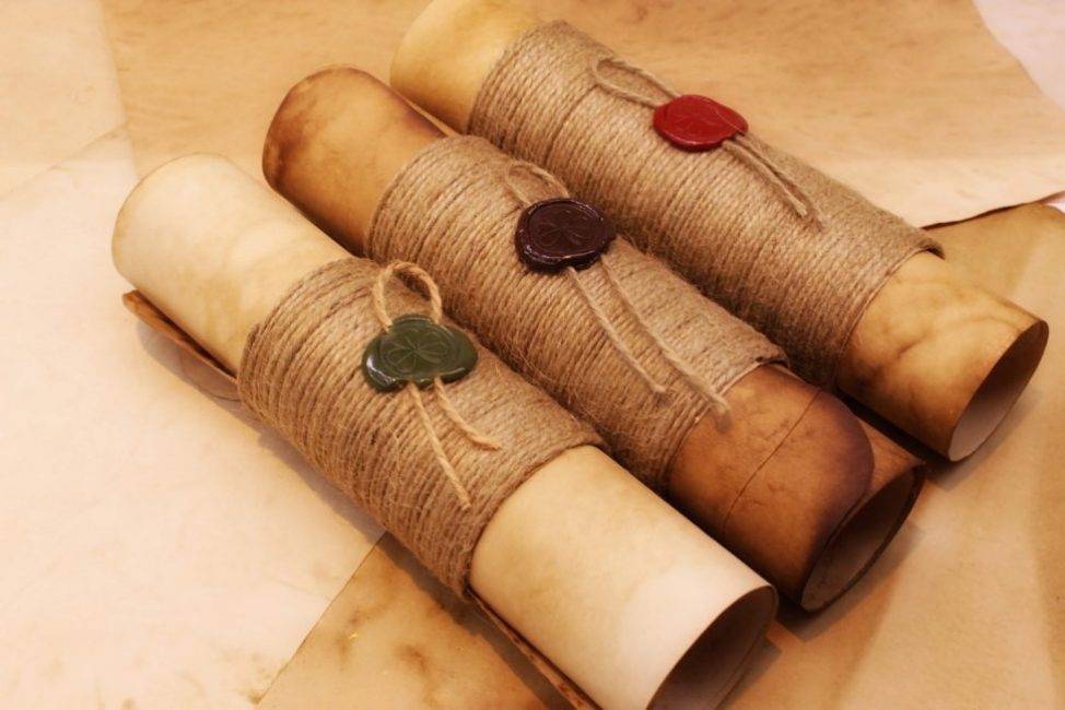 Теперь карту необходимо состарить. Опалите края и прожгите несколько мест зажигалкой. Готовый лист сверните и подвяжите лентой.