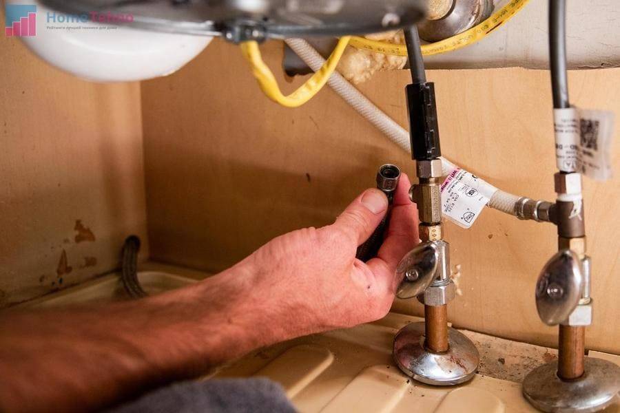 Для самостоятельного подключения к сети водоснабжения необходимо перекрыть подачу воды в квартиру, открыть краны и слить её остатки из системы. Затем, при помощи разводного ключа, открутить накидную гайку и отсоединить гибкую подводку смесителя, в месте ее присоединения к трубе.