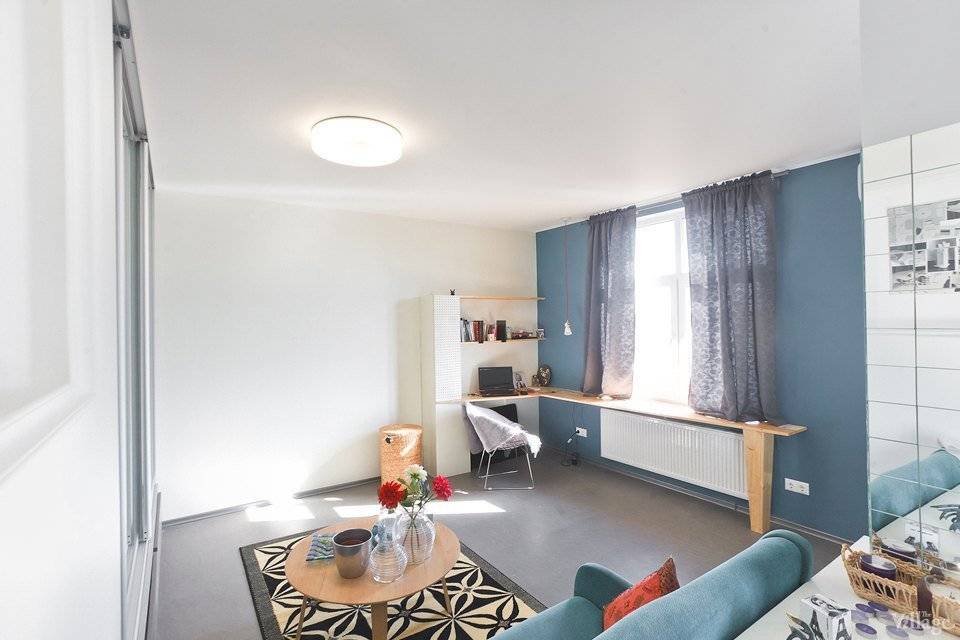 Отличный вариант однокомнатной квартиры со столом столешницей в гостиной и на кухне.