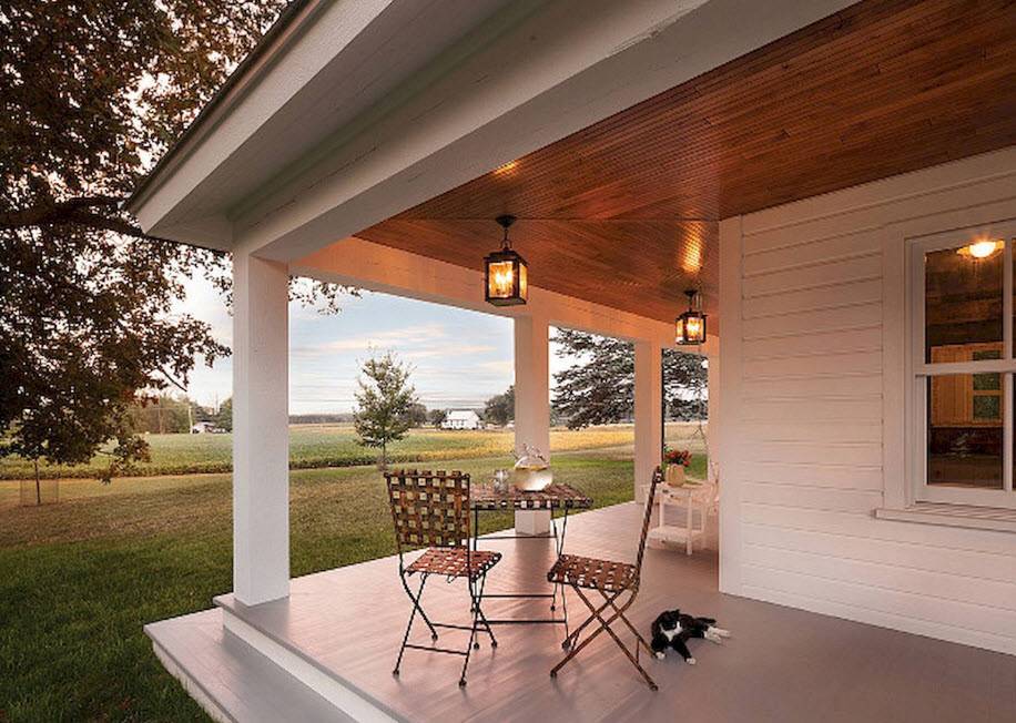 Крыльцо с закрытой верандой находится на одном фундаменте с домом. Подобная конструкция изначально заложена в проект коттеджа. Веранда выполняет те же самые функции, что и крыльцо-тамбур, но при этом обладает большим внутренним пространством, которое задействуют в разных целях.