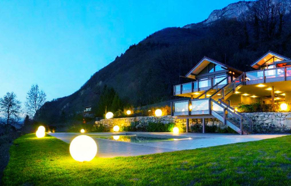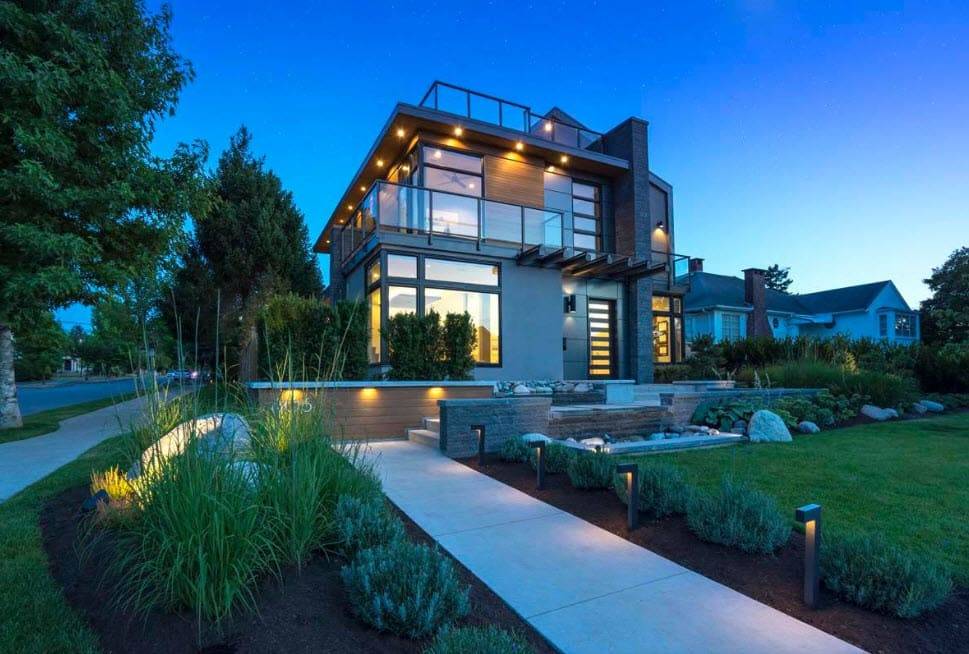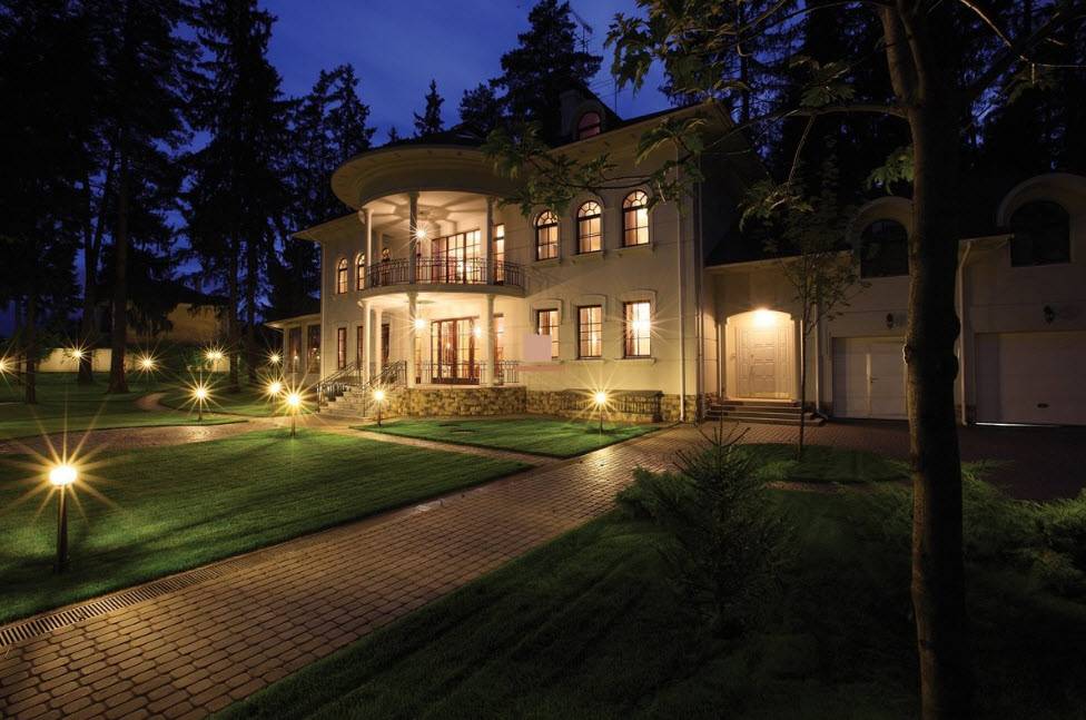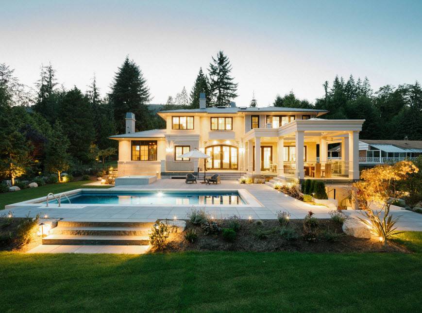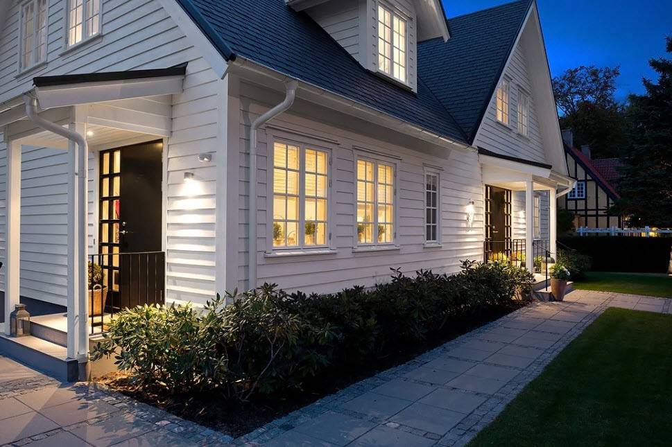 Скандинавский стиль – полная противоположность вычурному русскому. Нет никаких лишних деталей, при этом соблюдены все требования удобства и комфорта. Кажущаяся простота этого стиля скрывает продуманную организацию всех мелочей. Как правило, используется белый камень или плитка, столбики ограждения тоже каменные или бетонные.