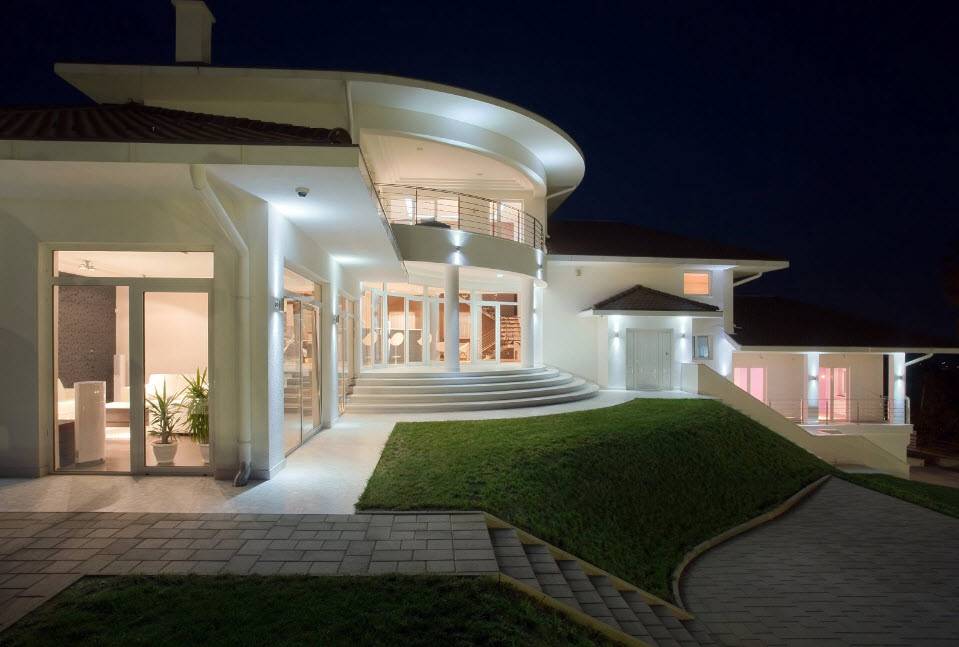 Овальная крылечная конструкция делает углы дома более сглаженными и придает экстерьеру некой изящности. Лучше всего если такое сооружение будет выполнено из камня или кирпича.