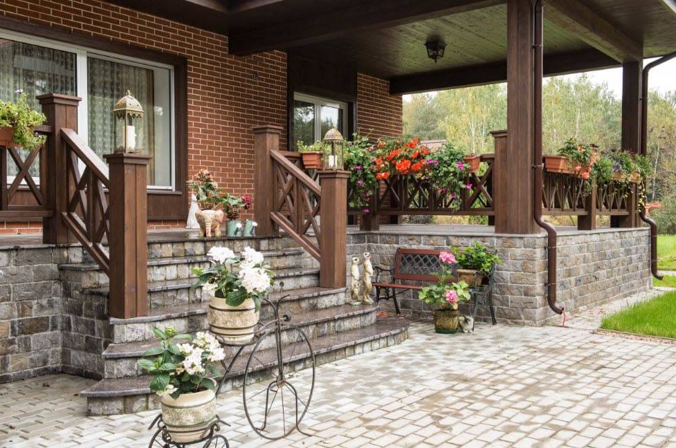 Ступени и саму площадку лучше выполнить из камня, бетона и кирпича, а если будет выбрана древесина, то обязательно с защитной пропиткой от влаги и насекомых. Для крыльца-террасы потребуется сделать ограждение по периметру из бетона, металла, дерева или их комбинаций.