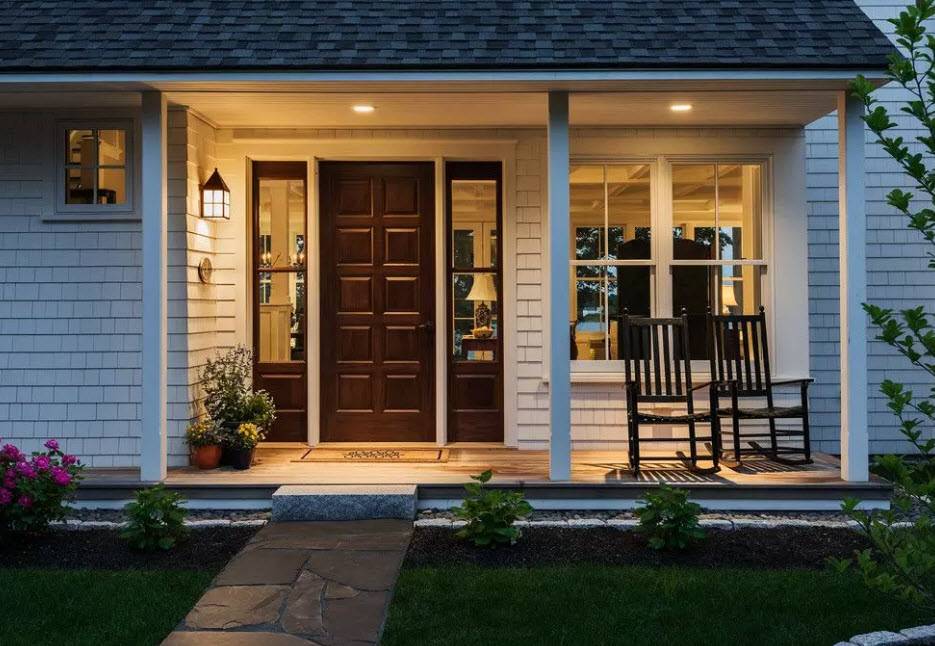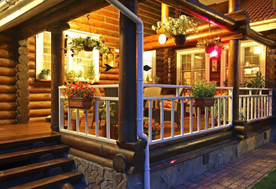 Важно! При строительстве крыльца своими руками нужно следить за тем, чтобы сохранялась текстура живого природного материала. Уличные фонари с рассеянным жёлтым светом и «бабушкины» коврики на ступеньках уместны в любом кантри