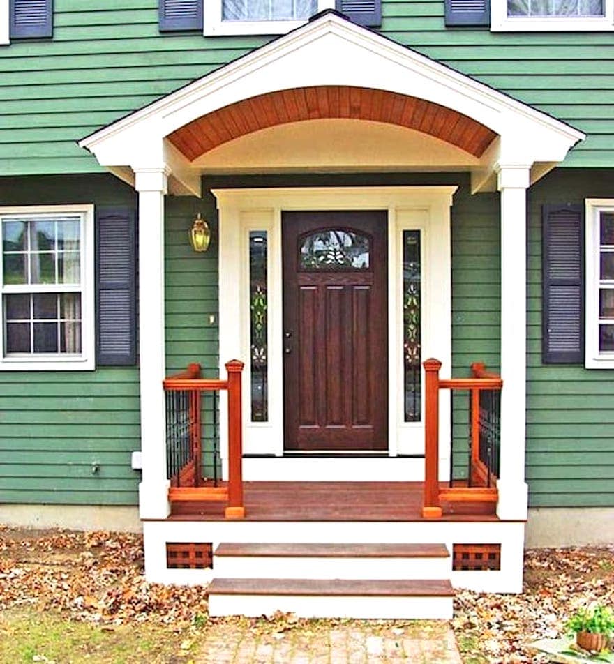 Навес может представлять собой небольшой козырек над входом открытого крыльца либо же являться продолжением крыши и защищать большую территорию, включая ступени. Чаще всего выбираются односкатная или двускатная форма конструкции либо же купольная или арочная, располагающаяся на высоте не менее 20 сантиметров над входной дверью.