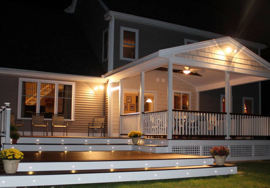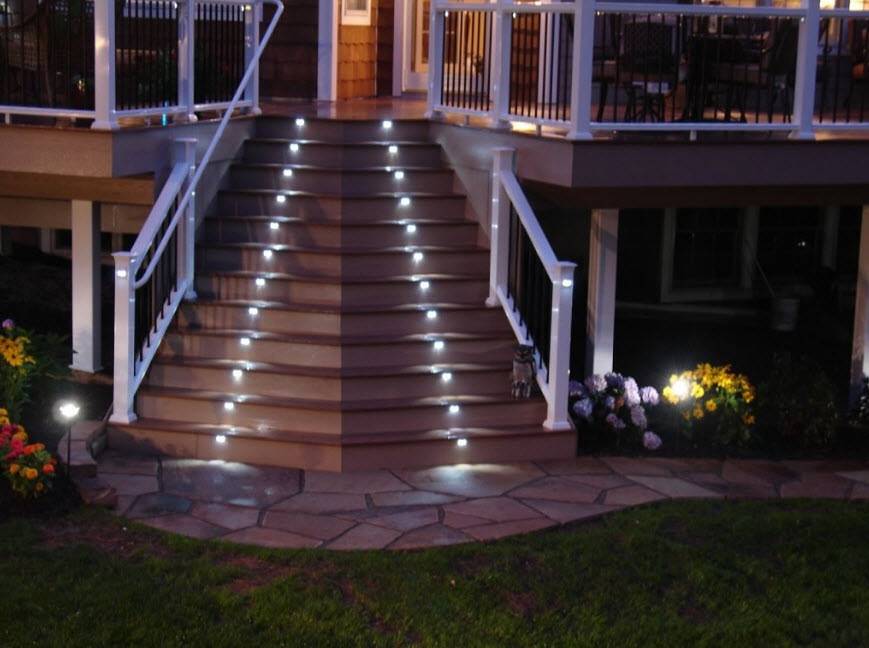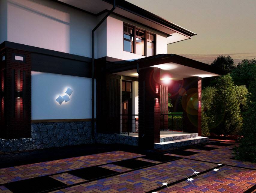 освещение – одновременно функциональный и декоративный элемент крыльца. Выбор садовых светильников огромен, поэтому можно будет украсить вход в дом необычным фонарем, светодиодной подсветкой, камнями-светильниками или даже гирляндами;