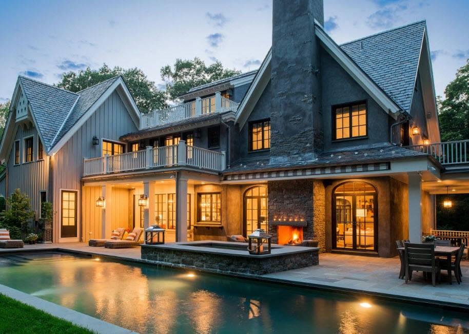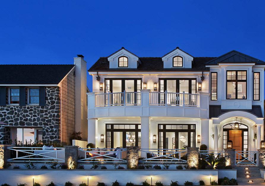 Если пространство позволяет, то из крыльца можно сделать даже не одну, а несколько зон отдыха. Две лестницы ведут на обширную площадь из разных точек участка. Аккуратные белые перила из дерева плавно трансформируются в оградительные элементы площадки. Справа от входа располагается зона принятия пищи со столом и набором стульев, а также пара шезлонгов. На левой стороне место заняло джакузи, а у самих ступеней расположились пара барбекю. Крыльцо украшено настенными светильниками и горшками с растениями, установленными не только на полу, но и на ступенях и перилах.