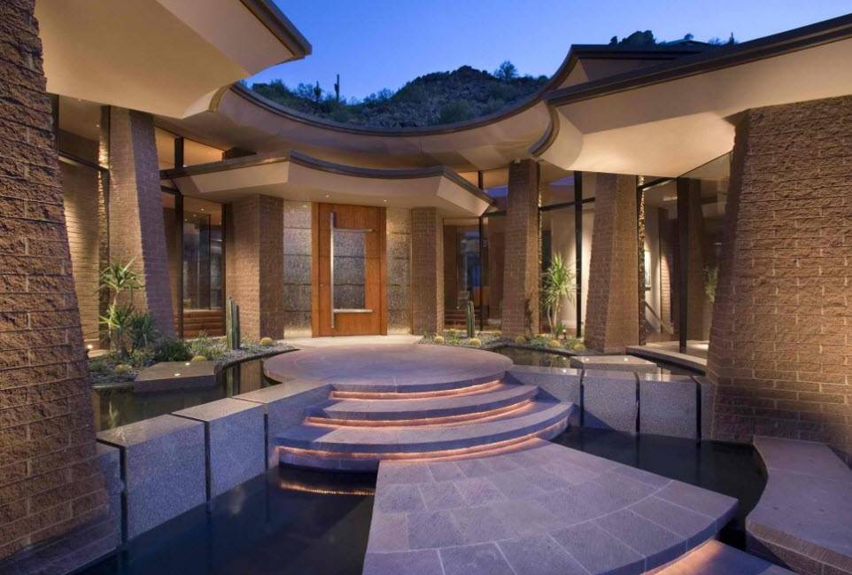 Входная группа, для оформления которой выбран средиземноморский стиль, лучше всего будет смотреться возле дома в теплых климатических широтах. Спуск по широким белым мраморным ступенькам прямо к морю или бассейну по-настоящему шикарен. Колонны и горшки-амфоры с высаженными в них южными цветами и растениями придадут изысканности композиции.