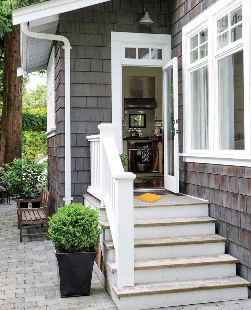 Круговые ступени, огибающие пристройку, обеспечивают удобный подъем со всех трех сторон. Такая конструкция для дома заменяет крыльцо с несколькими лестничными спусками.