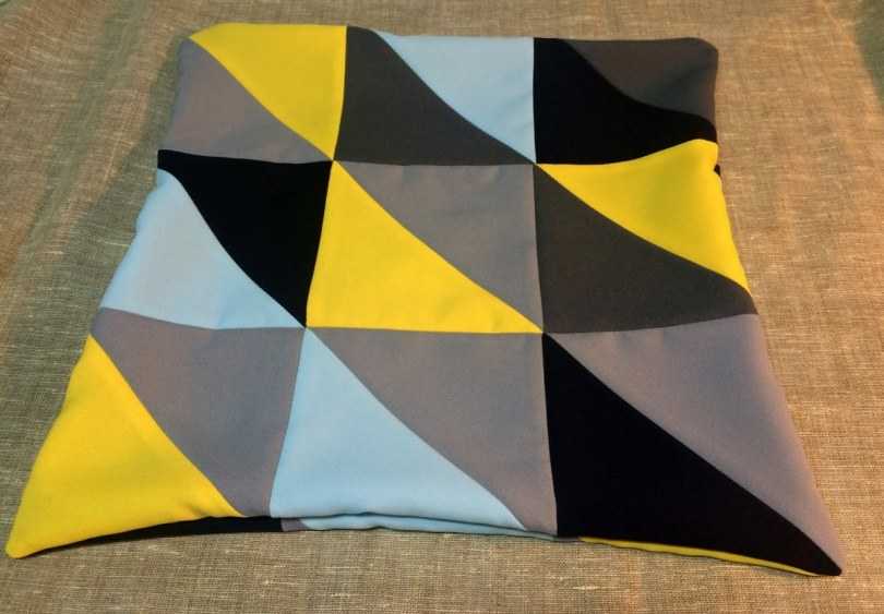 Это классическая квадратная подушка с наполнителем, которую легче всего пошить даже «на глаз». Просчитай нужные размеры, начерти на ткани квадраты, сострочи фрагменты и заполни середину. Для удобства можешь вшить молнию, чтобы снимать и стирать чехол отдельно.