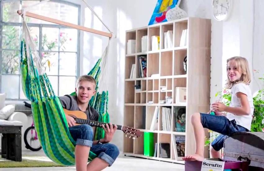 - Гамак . Их нельзя подвесить к потолку. Нужно натягивать между двумя опорами. В основном деревьями. Предназначены скорее для отдыха лежа, а не сидя.