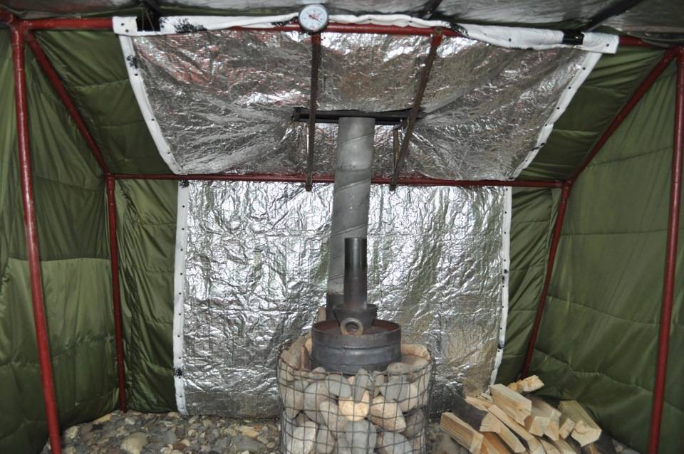 Установка походной бани «по белому» не сложнее и не легче предыдущего способа, отличие только в варианте монтажа парилки и конструкции печи. Сначала, как и в первом случае, разжигаем костер с заранее подготовленными камнями. При создании походной бани «по белому» костер должен иметь следующую конструкцию: сначала выкладываются камни, на них укладываются дрова, после этого выкладываются оставшиеся камни и еще один слой дров. Такая конструкция самодельной печи-каменки позволит камням быстрее нагреться, при чем, всему объему камней.
