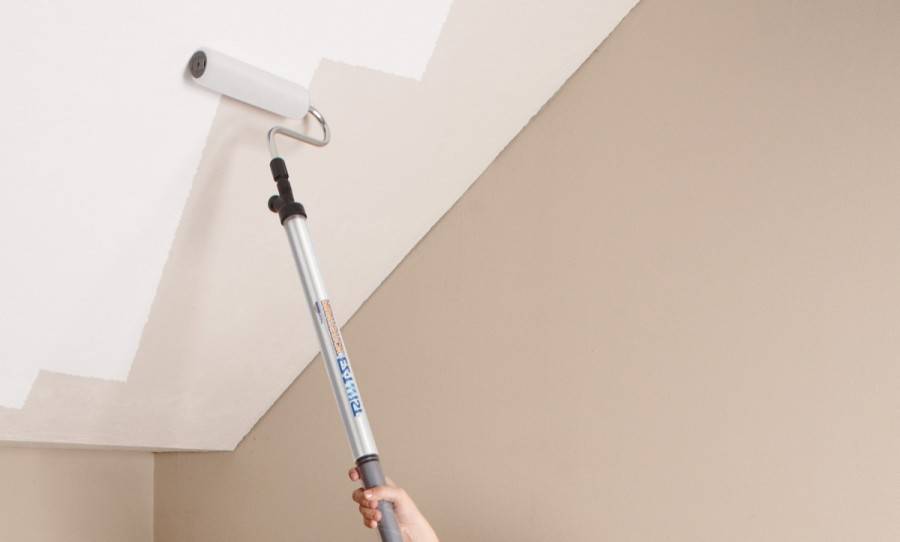 Выбору валика посвятите максимум внимания: качество покраски — отсутствие полос на потолке — во многом зависит от того, насколько хороший вы подобрали инструмент. Удобнее белить потолок водоэмульсионкой не со стремянки, а с пола. Для этого валик насаживают на длинный черенок и хорошо закрепляют.