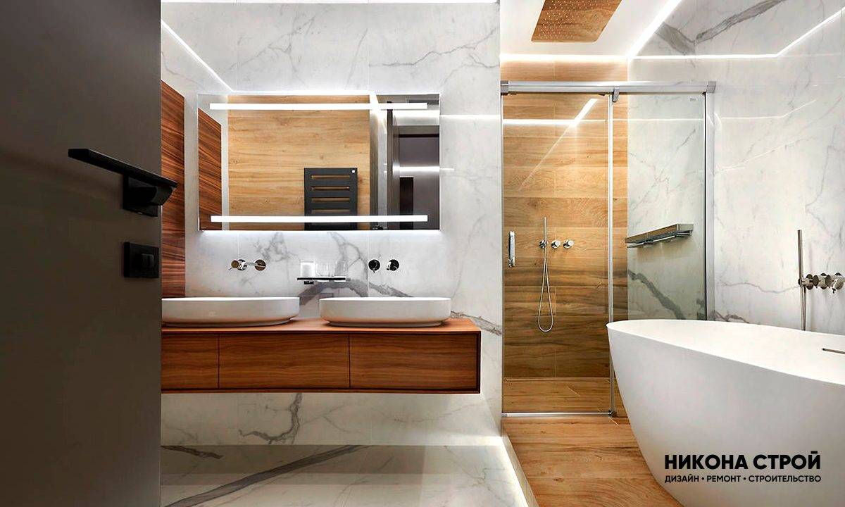 В оформлении ванных комнат можно, не раздумывая, вводить отделку из натурального дерева или его имитации. Наиболее подходящей для этих целей считается древесина бука, тика, дуба, обработанная специальной влагоустойчивой пропиткой. Дерево всегда создает особую атмосферу уюта, душевности, теплоты, плюс никогда не выходит из моды, и даже через 5-10 лет будет выглядеть так же актуально, как и на момент выполнения ремонта. Наиболее актуальными на сегодняшний день являются такие расцветки, как темный венге, золотистый орех, дуб рустикаль.