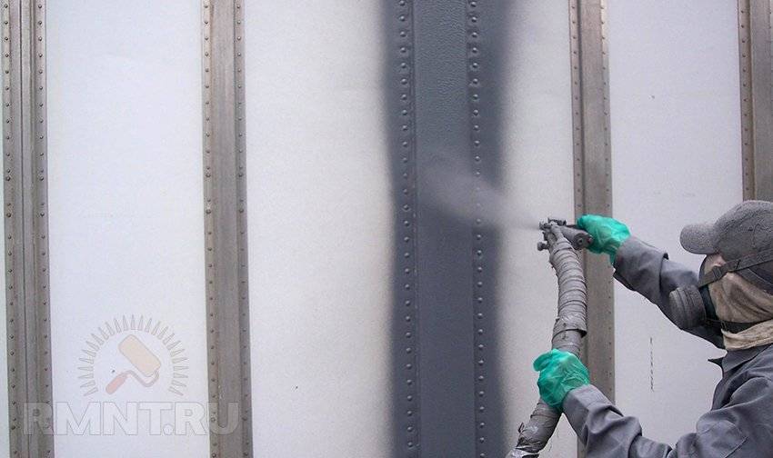 Далее можно приступать к напылению материала. Наиболее часто используемым способом нанесения полимера, который применяется в 95% случаев, является напыление с помощью специального оборудования. Операция проводится в несколько этапов: