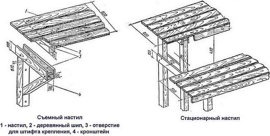 Получается, что залезать на полок проблематично, особенно людям невысокого роста. Потому в парной нужны приставные скамейки. Их делают разно высоты, для разных людей. Они должны быть достаточно широкими — примерно 40 см — чтобы при необходимости можно было посидеть. Конструкция обычно незамысловатая: продольные хорошо отшлифованные планки толщиной не менее 2-3 см (им вес выдерживать). Ножки толстые и устойчивые.