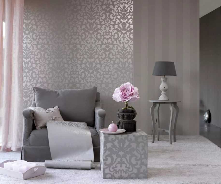 Белые или пастельные полотна на стенах могут иметь некоторый орнамент или плавные рисунки. Например, для шикарных помещений с интерьером классик подойдут полотна, с изображенными на них вензелями, выполненными в виде структурных серебристых элементов. Такие полотна станут достойным фоном для изящной мебели светлого тона.