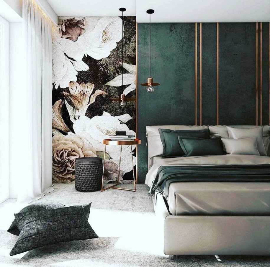 Самые модные сочетания — использование серого и пастельных тонов. Серые обои за кроватью и пастельно-зеленые шторы гарантируют, что интерьер будет не только красивым, но и уютным. Решаясь на серые обои в спальне, не забудьте выбрать правильное изголовье. Лучше всего будут смотреться контрастные цвета: