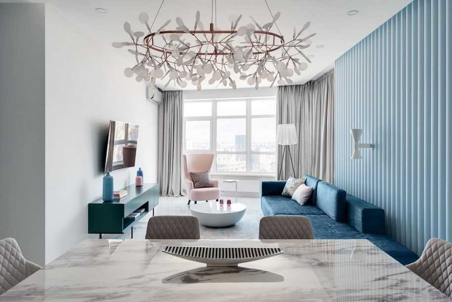 Комната, в которой гости проводят больше всего времени. Стерильный минимализм может делать помещение не таким уютным, каким его делает классический стиль. Полоска на стенах поможет исправить эту проблему без ущерба стилю.