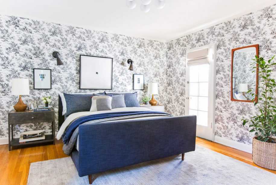 Актуальным решением сейчас становится отделка стен обоями-компаньонами. Например, полотнами с одинаковой фактурой, но разным рисунком. Такие варианты прекрасно подходят для зонирования спальни, создания интересных визуальных эффектов.