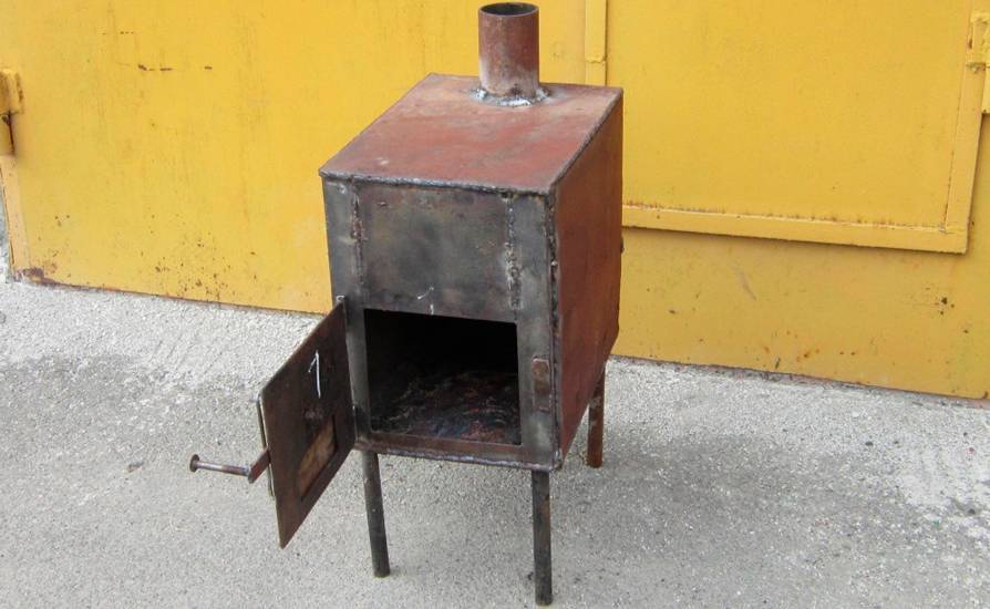 Трубу отрезают по размерам. Проделывают отверстия для дверей зольника и топки. Заваривают среднюю стенку с отверстием под колосники, верх с отверстием для трубы и низ печи. Приваривают дымоотвод, петли, щеколды и двери. Устанавливают колосники.