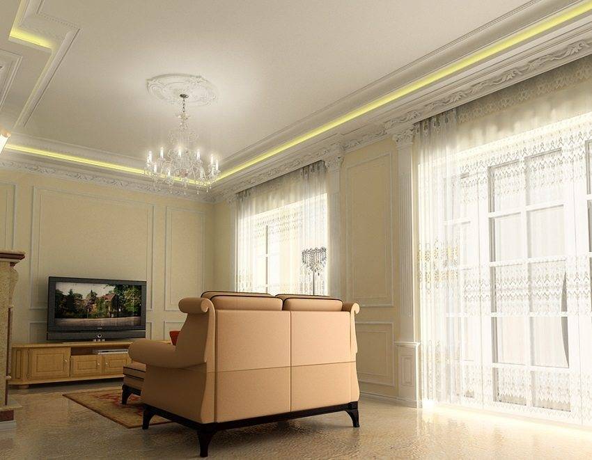Для дизайнерского карниза используют пенопластовые плинтуса, имеющие сложный профиль. Часто для того, чтобы сделать широкий плинтус со скрытой подсветкой и не переживать по поводу надежности его крепления, покупают не один цельный массивный профиль, а набирают из отдельных более мелких элементов. Так, в нижней части можно наклеить реечный фигурный багет, который будет крепко удерживаться на поверхности, а верхнюю часть наборного карниза уже клеить из профиля плинтусного типа.