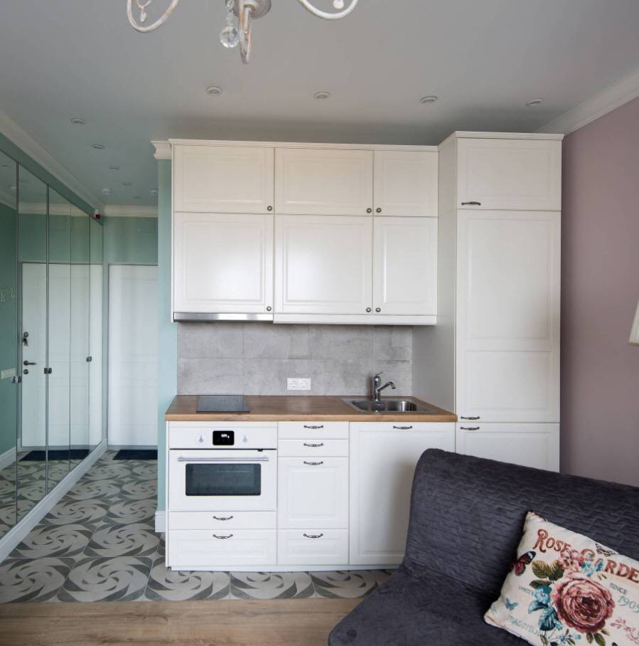 Если кухня размером под потолок, то сначала монтируется шкаф, а потом к нему крепится натяжной потолок. Высота потолка рассчитывается исходя и венткоробок, каналов и коммуникаций на потолке и встроенных светильников. Также необходим зазор между натяжным потолком и шкафом для открывания распашных дверей.