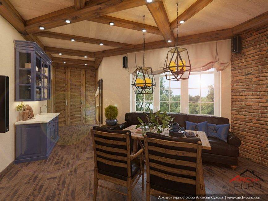 Центром комнаты становится большой дубовый стол, стулья или скамьи располагают вокруг него. Сгладить некоторую грубоватость интерьера позволяют цветные дорожки на полу, вышитая кружевная скатерть, аналогичные занавески и полотенца. Дополняют интерьер веники и пучки сухих трав, подвешенные к потолку, а также глиняная посуда, самовар на столе.