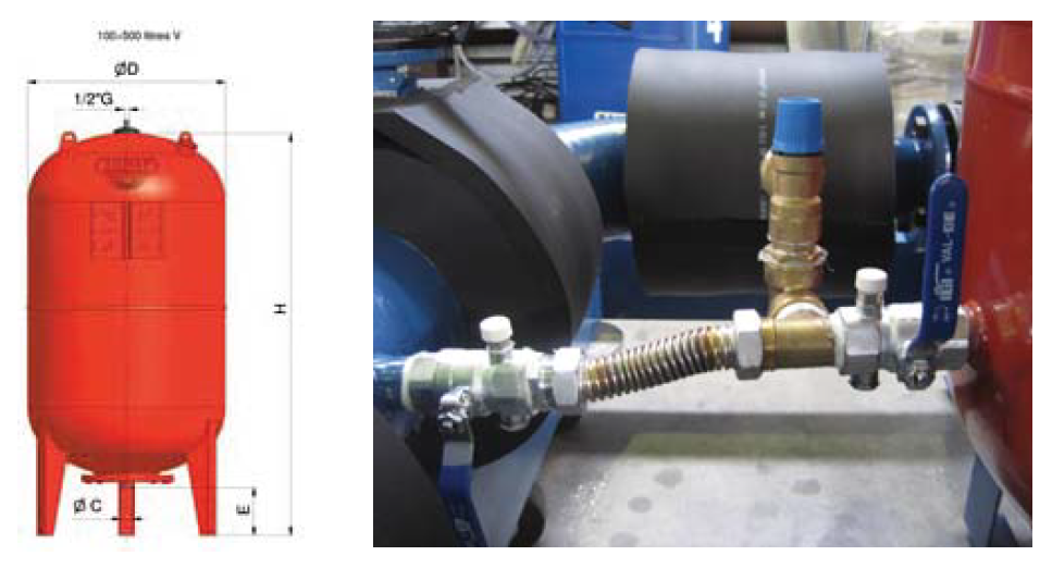 Мембранный вертикальный расширительный бак, с резьбовым соединением снизу, PN10. Бак имеет возможность замены резиновой мембраны. Бак укомплектован гибкой подводкой из металлического гофрированного шланга диаметром 1″ длиной 1,5 м, двумя отсечными шаровыми вентилями 1″ со спускниками и предохранительным клапаном 1″, с настройкой на «сброс» на 8 бар.